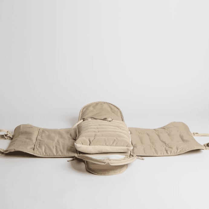 キルティングナイロン(外側)、ライニング素材(内側)、取り外し可能クッション付き